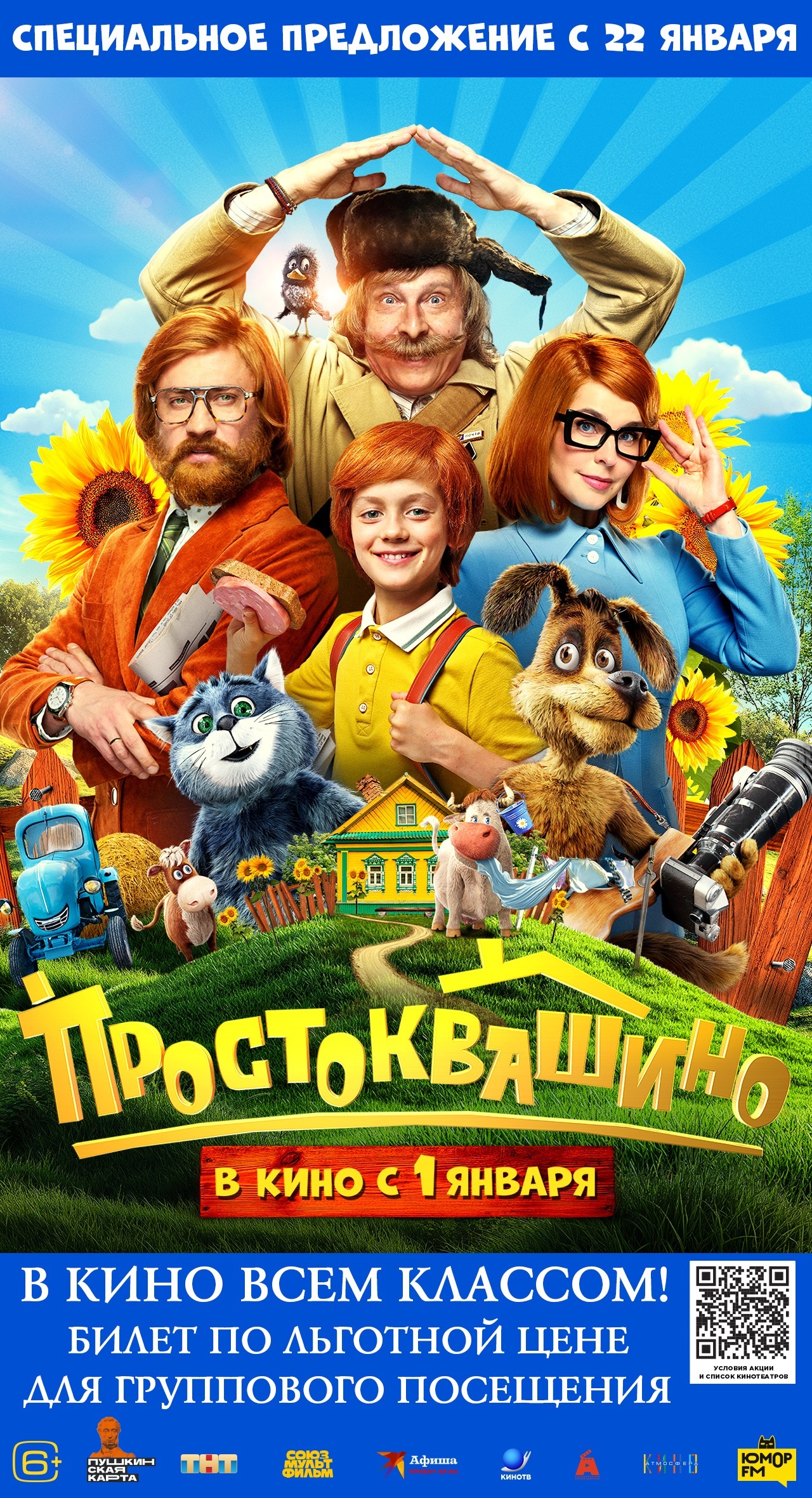 Акционерным обществом «Газпром-Медиа Холдинг» организована социально значимая акция «В кино всем классом», в рамках которой с 22 января 2026 года и до окончания срока проката организованные группы школьников смогут посмотреть художественный фильм «Простоквашино» (2025, 6-8+) режиссёра Сарика Андреасяна. Продолжительность – 1 час 45 минут.